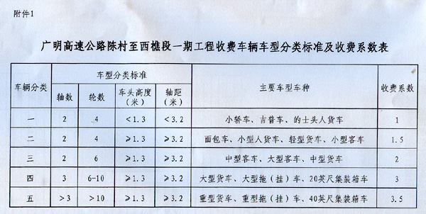 粵交費(fèi)〔2014〕1681號(hào)請(qǐng)示收悉。同意廣明高速公路陳村至西樵段一期工程建成通車和收費(fèi)站收費(fèi)設(shè)施經(jīng)驗(yàn)收符合省聯(lián)網(wǎng)收費(fèi)技術(shù)要求后開(kāi)始收費(fèi),收費(fèi)車型按全省高速公路統(tǒng)一標(biāo)準(zhǔn),即按車輛軸(輪)數(shù)及車頭高度等物理參數(shù)進(jìn)行分類,一至五類車的收費(fèi)系數(shù)分別為1、1.5、2、3、3.5,收費(fèi)標(biāo)準(zhǔn)為0.6元/標(biāo)準(zhǔn)車公里。