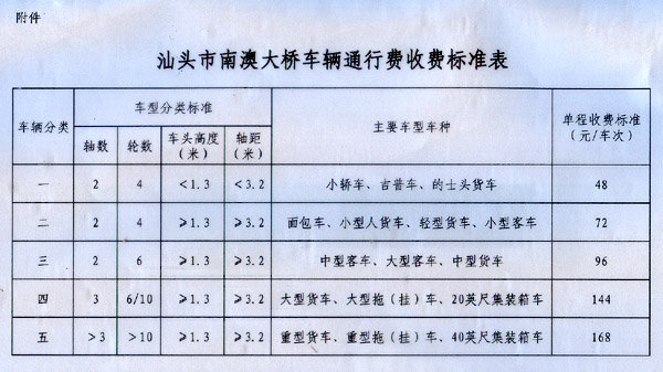 粵交費(fèi)〔2015〕197號(hào)請(qǐng)示收悉。同意汕頭市南澳大橋項(xiàng)目建成通車后在大橋接入南澳島處設(shè)置南澳大橋收費(fèi)站,單向收取入島車輛雙程通行費(fèi)。收費(fèi)車型按車輛軸(輪)數(shù)及車頭高度等物理參數(shù)進(jìn)行分類,一至五類車的收費(fèi)系數(shù)分別為1、1.5、2、3、3.5;單程收費(fèi)標(biāo)準(zhǔn)分別為48、72、96、144、168元/車次。
