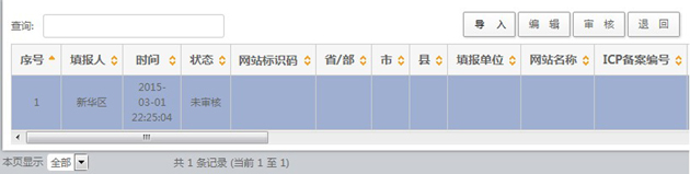 (三)逐級審核。 組織單位在收到上報文件后,使用賬號和密碼登錄報送系統(tǒng),在“政府網(wǎng)站和欄目(系統(tǒng))基本信息表”的數(shù)據(jù)管理頁面中,將上報文件導(dǎo)入系統(tǒng)。