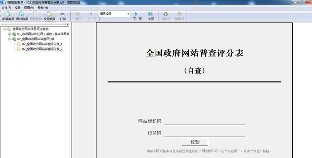 三、檢查整改階段使用說明 (一)填報單位自查。 填報單位打開客戶端軟件,選取“全國政府網(wǎng)站普查評分表”并新建數(shù)據(jù),首先輸入“網(wǎng)站標(biāo)識碼”和“校驗碼”,通過驗證后,填寫該網(wǎng)站的自查評分信息并保存。