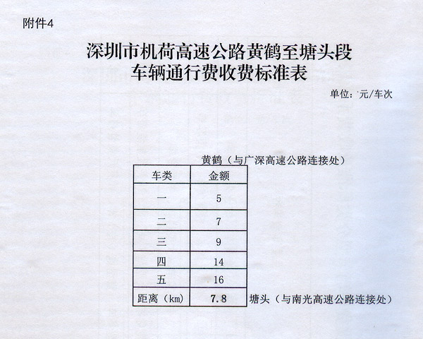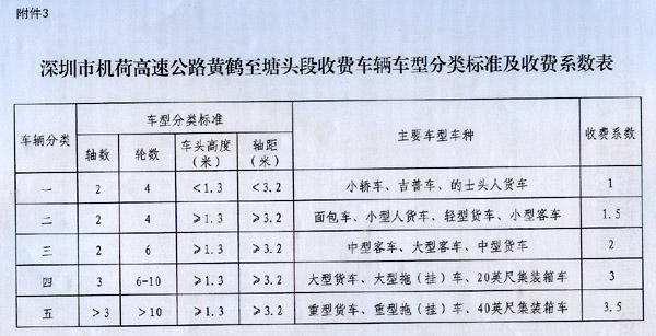 2.深圳市梅觀高速公路觀瀾至黎光段車輛通行費收費標準表 3.深圳市機荷高速公路黃鶴至塘頭段收費車輛車型分類標準及收費系數(shù)表 4.深圳市機荷高速公路黃鶴至塘頭段車輛通行費收費標準表 ?