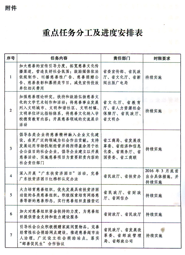 一、總體要求 (一)指導(dǎo)思想。以鄧小平理論、“三個代表”重要思想、科學(xué)發(fā)展觀為指導(dǎo),緊緊圍繞“三個定位、兩個率先”的目標(biāo)任務(wù),堅持政府引導(dǎo)、社會實(shí)施、公眾參與、專業(yè)運(yùn)作,積極培育慈善組織,廣泛開展志愿服務(wù)活動,大力弘揚(yáng)先進(jìn)慈善文化,推進(jìn)慈善事業(yè)全民化、社會化、常態(tài)化、規(guī)范化發(fā)展,努力形成具有廣東特色的現(xiàn)代慈善事業(yè)發(fā)展新格局。