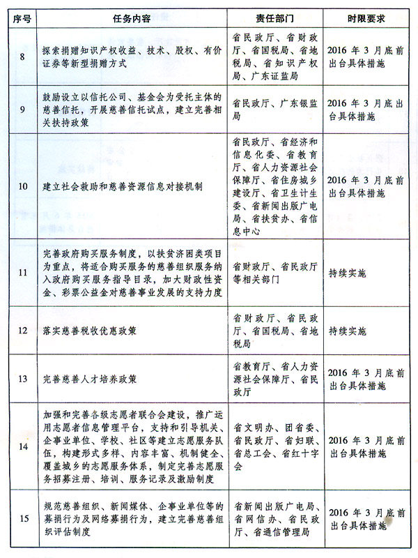 6.完善志愿服務(wù)促進(jìn)慈善事業(yè)發(fā)展政策。認(rèn)真貫徹落實(shí)《廣東志愿服務(wù)條例》,加強(qiáng)和完善各級志愿者聯(lián)合會建設(shè),全面推廣運(yùn)用志愿者信息管理平臺,發(fā)揮廣東志愿者服務(wù)基金的作用,支持和引導(dǎo)機(jī)關(guān)、企事業(yè)單位、學(xué)校、社區(qū)等建立志愿服務(wù)隊伍,構(gòu)建形式多樣、內(nèi)容豐富、機(jī)制健全、覆蓋城鄉(xiāng)的志愿服務(wù)體系。鼓勵志愿服務(wù)組織與慈善組織合作參與慈善活動,促進(jìn)志愿服務(wù)制度化、常態(tài)化。制訂完善志愿服務(wù)招募注冊、培訓(xùn)、服務(wù)記錄及激勵制度,引導(dǎo)更多的人參與志愿服務(wù)。