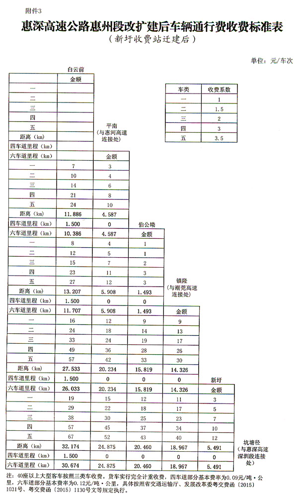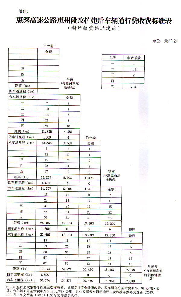? 廣東省人民政府關(guān)于惠深高速公路惠州段 調(diào)整車輛通行費收費標(biāo)準(zhǔn)有關(guān)問題的批復(fù) ? 省交通運輸廳、發(fā)展改革委: 粵交費〔2016〕135號請示收悉。同意惠深高速公路惠州段改擴建工程交工驗收通車和收費站收費設(shè)施經(jīng)驗收符合省聯(lián)網(wǎng)收費技術(shù)要求后調(diào)整車輛通行費收費標(biāo)準(zhǔn),收費車型按國家統(tǒng)一標(biāo)準(zhǔn)進行分類,1至5類車的收費系數(shù)分別為1、1.5、2、3、3.5,改擴建段(30.674公里)收費標(biāo)準(zhǔn)調(diào)整為0.6元/標(biāo)準(zhǔn)車公里,起點段(1.5公里)收費標(biāo)準(zhǔn)保持0.45元/標(biāo)準(zhǔn)車公里不變;貨車實行完全計重收費,改擴建段(30.674公里)基本費率調(diào)整為0.12元/噸。公里,起點段(1.5公里)基本費率保持0.09元/噸。公里不變。