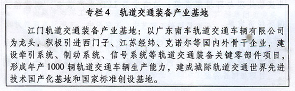 (四)軌道交通裝備。 以江門市為主,依托珠三角城際軌道交通網(wǎng)絡(luò)建設(shè),重點(diǎn)發(fā)展軌道交通裝備及其關(guān)鍵系統(tǒng)零部件,建立健全研發(fā)設(shè)計(jì)、生產(chǎn)制造和產(chǎn)品標(biāo)準(zhǔn)、知識(shí)產(chǎn)權(quán)保護(hù)體系,提升裝備自主化能力。加快延伸產(chǎn)業(yè)鏈,大力提高整車配套和生產(chǎn)能力。研究開發(fā)磁懸浮、真空管道等超高速軌道交通技術(shù)及相關(guān)裝備。到2017年,形成1000輛軌道交通車輛年生產(chǎn)能力。到2020年,建成世界一流的高端軌道交通裝備修造產(chǎn)業(yè)基地。