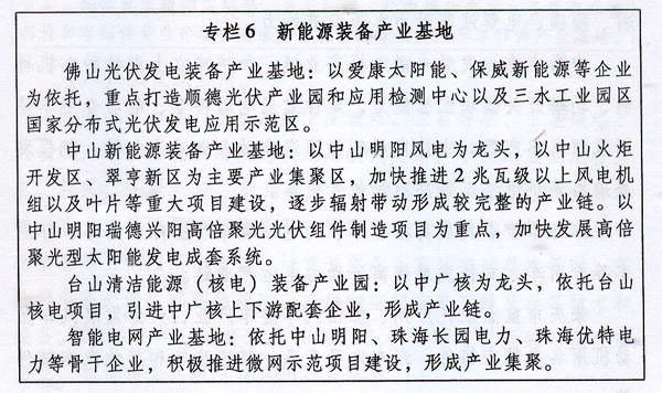 重點(diǎn)發(fā)展光伏裝備、風(fēng)電裝備和核電裝備,延伸發(fā)展產(chǎn)業(yè)鏈,加快發(fā)展新型傳感測(cè)量、通訊信息、電能質(zhì)量控制、決策支持、超導(dǎo)、分布式電源柔性接入技術(shù)等智能電網(wǎng)先進(jìn)技術(shù),培育開發(fā)高溫氣冷堆、10兆瓦及以上風(fēng)電和光伏發(fā)電技術(shù)及裝備。以佛山市、中山市為主,重點(diǎn)發(fā)展高倍聚光型太陽能發(fā)電成套系統(tǒng);以中山市為主,重點(diǎn)發(fā)展大型風(fēng)電機(jī)組整機(jī)及部件,提升研發(fā)水平,加強(qiáng)海上風(fēng)電機(jī)組及風(fēng)光互補(bǔ)系統(tǒng)研制及產(chǎn)業(yè)化;以江門市為主,重點(diǎn)發(fā)展核電輔助裝備和非動(dòng)力核技術(shù)。到2017年,培育形成1-2家系統(tǒng)設(shè)計(jì)、設(shè)備制造一體化的輸配電工程總承包公司。到2020年,打造成為國內(nèi)重要的新能源裝備制造基地之一。