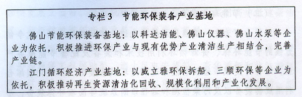 佛山市重點(diǎn)發(fā)展高效節(jié)能鍋爐窯爐、中央空調(diào)節(jié)能控制技術(shù)與設(shè)備、余熱余壓利用和節(jié)能在線監(jiān)測(cè)等節(jié)能裝備,培育發(fā)展環(huán)境污染控制設(shè)備(新型水處理裝備、工業(yè)廢氣凈化設(shè)備、垃圾焚燒設(shè)備)、環(huán)境污染修復(fù)設(shè)備(河涌清淤、淤泥處理與資源化成套技術(shù)和設(shè)備),推進(jìn)資源回收利用技術(shù)和設(shè)備的研發(fā)生產(chǎn)。