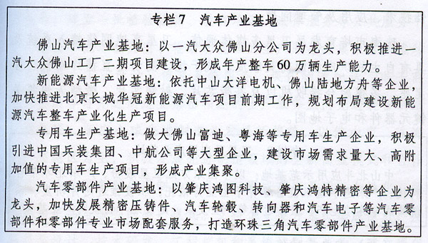 (七)汽車制造。 以佛山市為主,重點(diǎn)發(fā)展汽車整車、新能源汽車和專用車三大基地,研究和開發(fā)無人駕駛汽車等前沿技術(shù),延伸發(fā)展汽車尤其是新能源汽車關(guān)鍵零部件生產(chǎn),形成與整車生產(chǎn)能力相匹配的系統(tǒng)配套能力。到2017年,汽車整車年生產(chǎn)能力超過60萬輛,其中新能源汽車年綜合生產(chǎn)能力超過5萬輛。到2020年,新能源汽車年綜合生產(chǎn)能力20萬輛,成為全國重要的新能源汽車生產(chǎn)基地之一。
