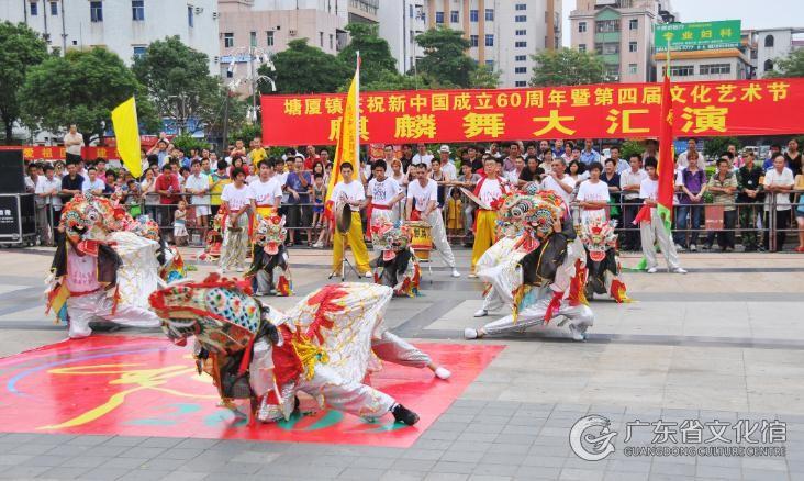 民國(guó)《東莞縣志》記載:“元旦至晦,結(jié)隊(duì)鳴征鼓,以紙糊麒麟頭,畫五采??p綿被為麟身,兩人舞之,舞罷,各演拳棒,曰舞麒麟。”歷史上,珠江三角洲麒麟舞以東莞最為鼎盛。塘廈鎮(zhèn)位于東莞市東南部,毗鄰港澳,塘廈舞麒麟至今已有三百多年歷史,主要流傳于鎮(zhèn)內(nèi)石潭埔、石馬、清湖頭、石鼓、橫塘、林村、蓮湖等多個(gè)村落。