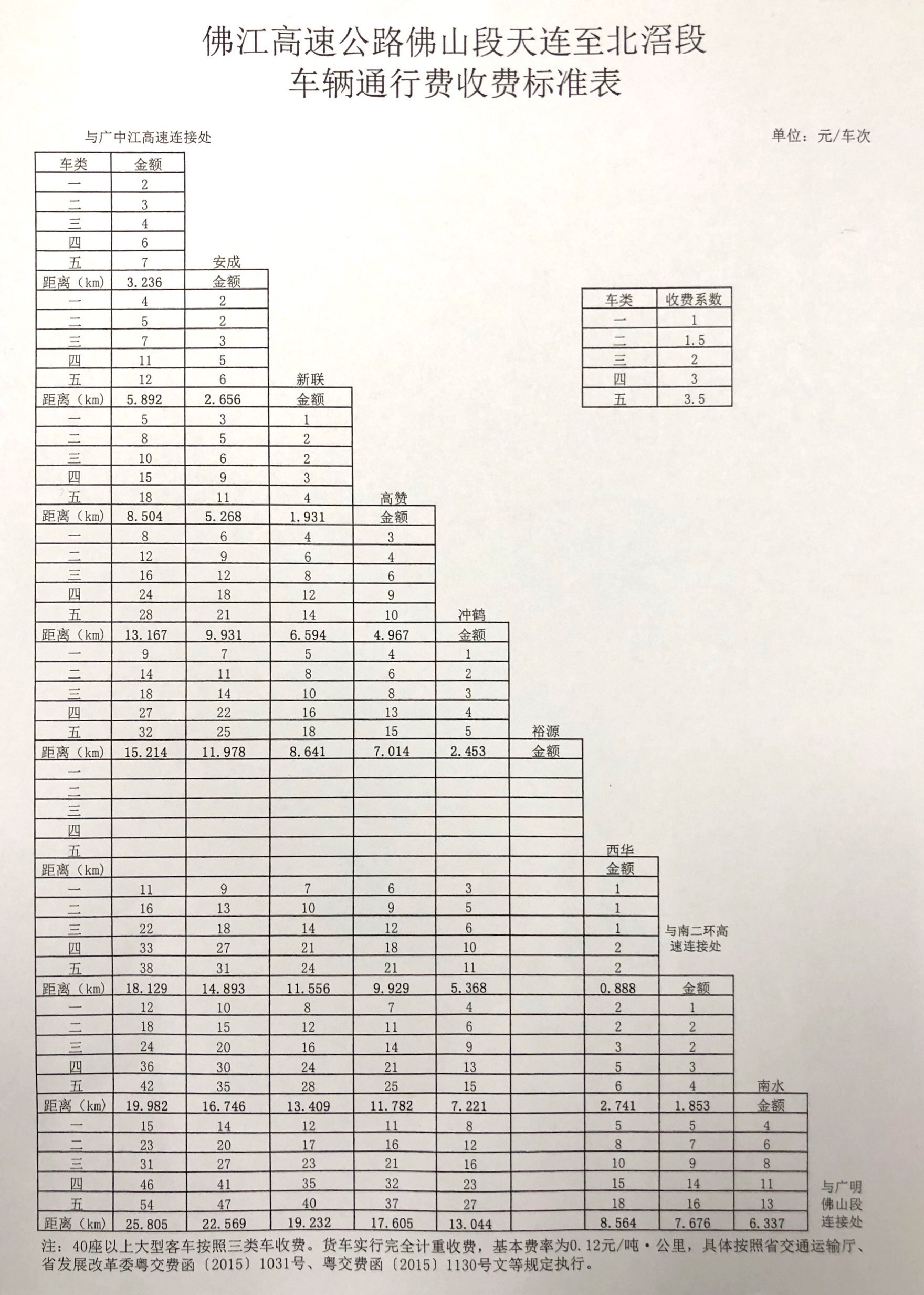粵交費(fèi)〔2019〕43號請示收悉。同意佛江高速公路佛山段天連至北滘段交工驗(yàn)收通車和收費(fèi)站收費(fèi)設(shè)施經(jīng)驗(yàn)收符合省聯(lián)網(wǎng)收費(fèi)技術(shù)要求后開始收費(fèi),收費(fèi)車型按國家統(tǒng)一標(biāo)準(zhǔn)進(jìn)行分類,1至5類車的收費(fèi)系數(shù)分別為1、1.5、2、3、3.5,收費(fèi)費(fèi)率為0.60元/標(biāo)準(zhǔn)車公里;貨車實(shí)行完全計(jì)重收費(fèi),基本費(fèi)率為0.12元/噸·公里。