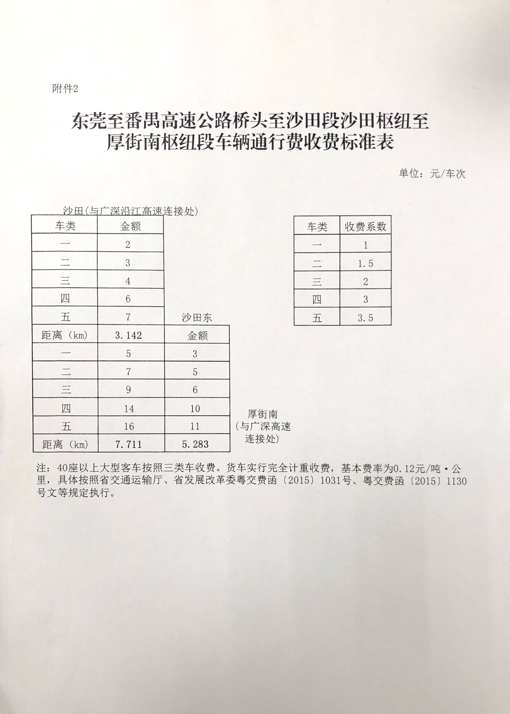 粵交費(fèi)〔2019〕333號(hào)請(qǐng)示收悉。同意東莞至番禺高速公路橋頭至沙田段沙田樞紐至厚街南樞紐段交工驗(yàn)收通車和收費(fèi)站收費(fèi)設(shè)施經(jīng)驗(yàn)收符合省聯(lián)網(wǎng)收費(fèi)技術(shù)要求后開(kāi)始收費(fèi),收費(fèi)車型按國(guó)家統(tǒng)一標(biāo)準(zhǔn)進(jìn)行分類,1至5類車的收費(fèi)系數(shù)分別為1、1.5、2、3、3.5;貨車實(shí)行完全計(jì)重收費(fèi),基本費(fèi)率為0.12元/噸·公里。