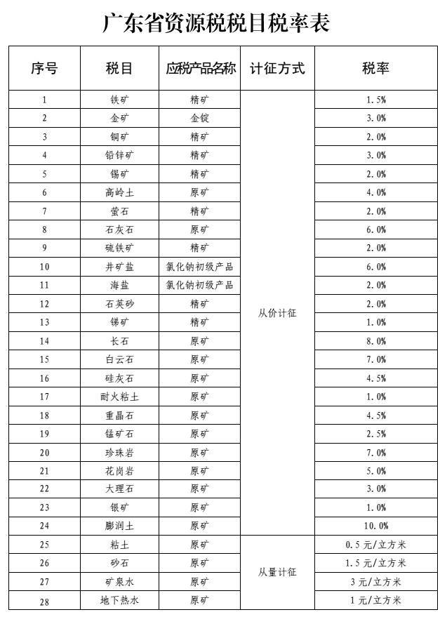 根據(jù)中央統(tǒng)一部署,自2016年7月1日起,我國全面推開資源稅改革。廣東省人民政府日前印發(fā)《關(guān)于實(shí)施資源稅改革的通知》稱,經(jīng)財(cái)政部、國家稅務(wù)總局核準(zhǔn)和備案同意,我省28個(gè)礦產(chǎn)資源品目納入資源稅改革范圍,其中鐵礦、金礦、銅礦、鉛鋅礦等24個(gè)品目由從量計(jì)征改為從價(jià)計(jì)征,對(duì)粘土、砂石(包括河沙、海沙和其他建筑用砂石)、礦泉水、地下熱水4個(gè)品目繼續(xù)實(shí)行從量計(jì)征。據(jù)悉,此次全面推開資源稅改革的主要內(nèi)容是從價(jià)計(jì)征、清費(fèi)立稅。按照稅費(fèi)平移、總體不增加企業(yè)稅負(fù)的原則,將礦產(chǎn)資源補(bǔ)償費(fèi)并入資源稅,改革后的資源稅稅負(fù)水平,與改革前資源稅和礦產(chǎn)資源補(bǔ)償費(fèi)合計(jì)負(fù)擔(dān)水平相當(dāng)。