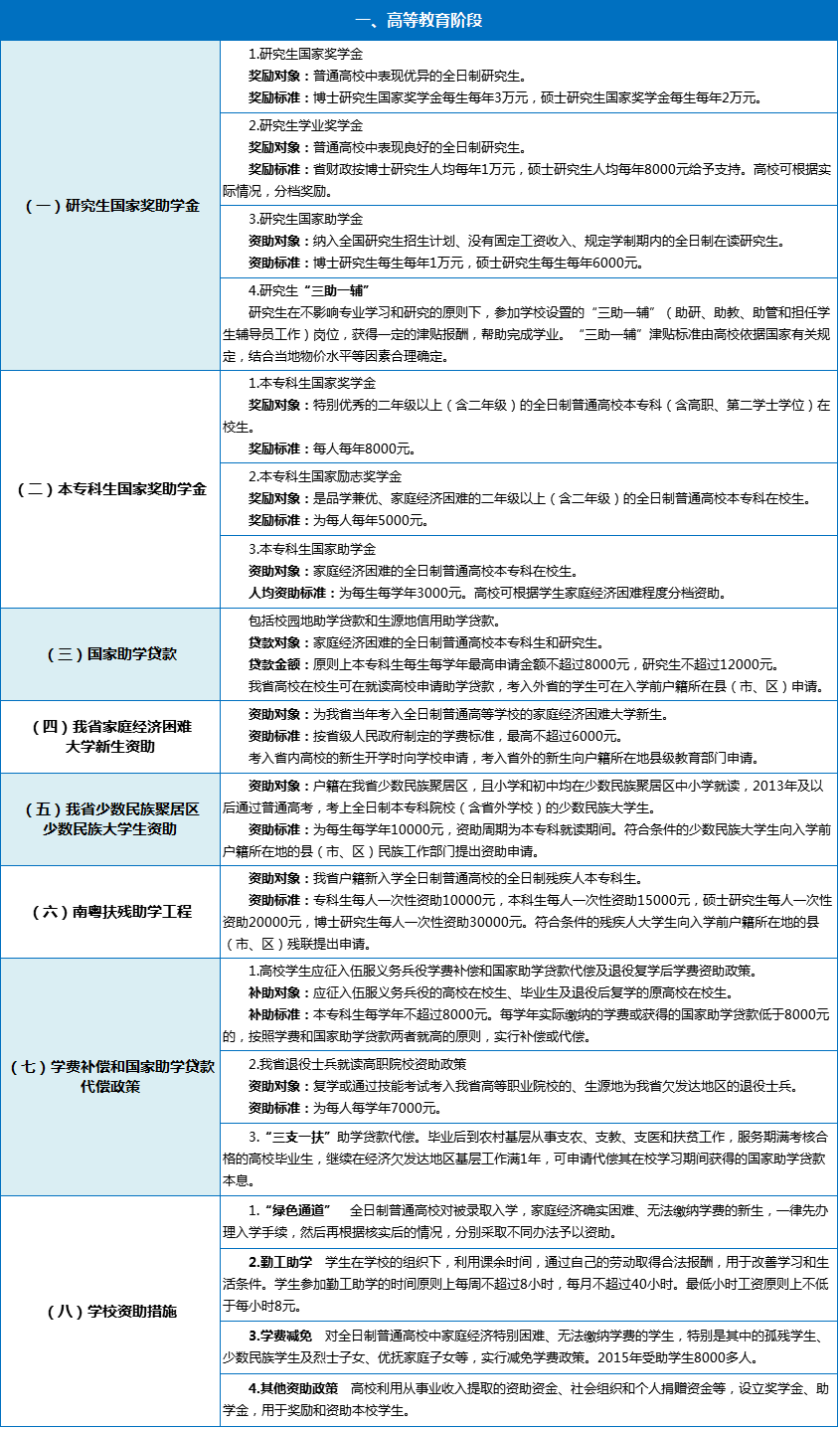 不難看出,廣東實現(xiàn)了從學(xué)前教育到研究生教育各階段資助政策的全覆蓋,在制度上保證了每一個孩子不因家庭經(jīng)濟(jì)困難而失學(xué),不讓孩子輸在起跑線上。也就是說,一名家庭經(jīng)濟(jì)困難孩子,從學(xué)前教育到研究生畢業(yè)都有相應(yīng)的資助政策。